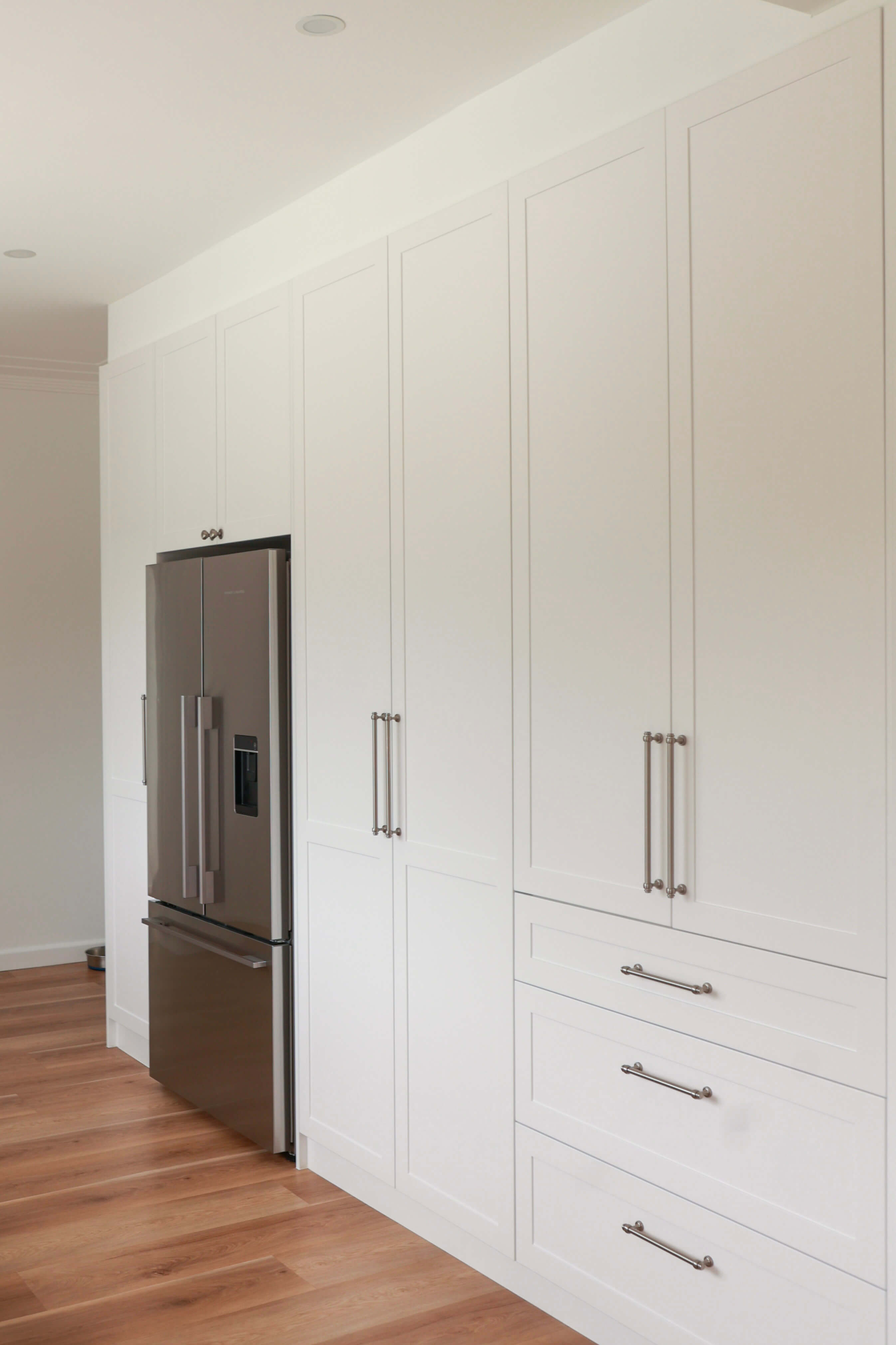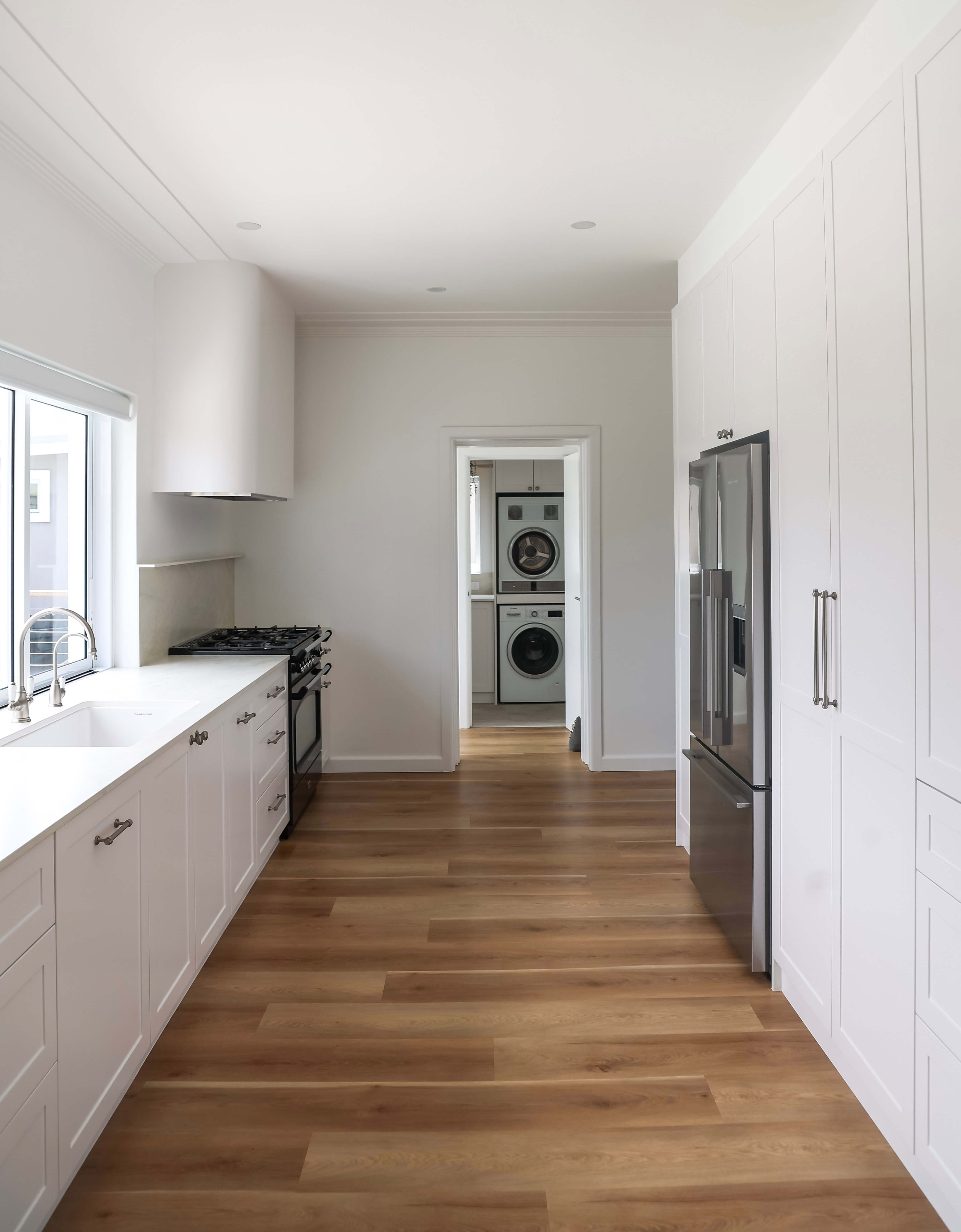 It’s not just the colour palette (though this crisp white-on-white scheme absolutely sets the tone). It’s the way every element feels intentional — the long run of shaker-style cabinetry, the soft warmth of timber underfoot, and the natural light pouring in through expansive windows overlooking lush greenery.