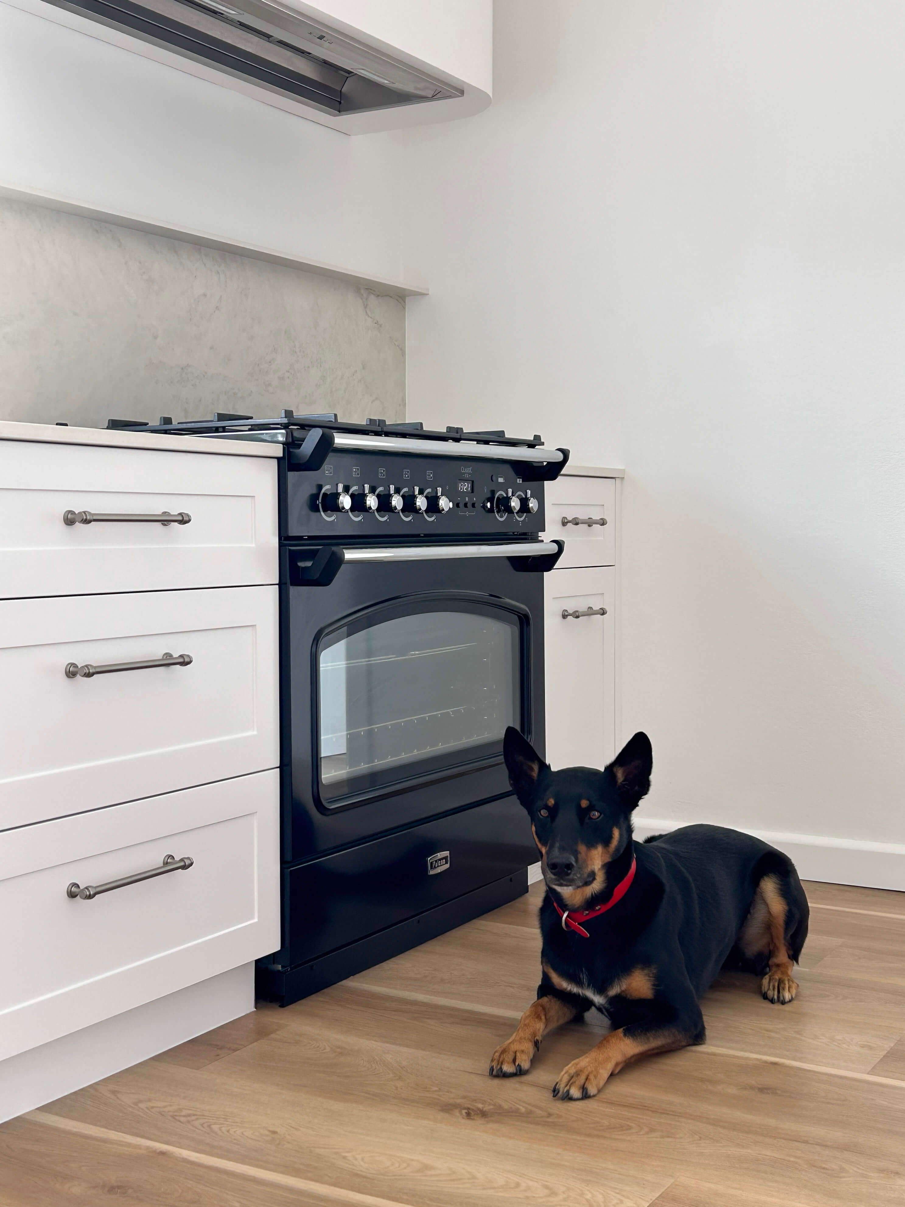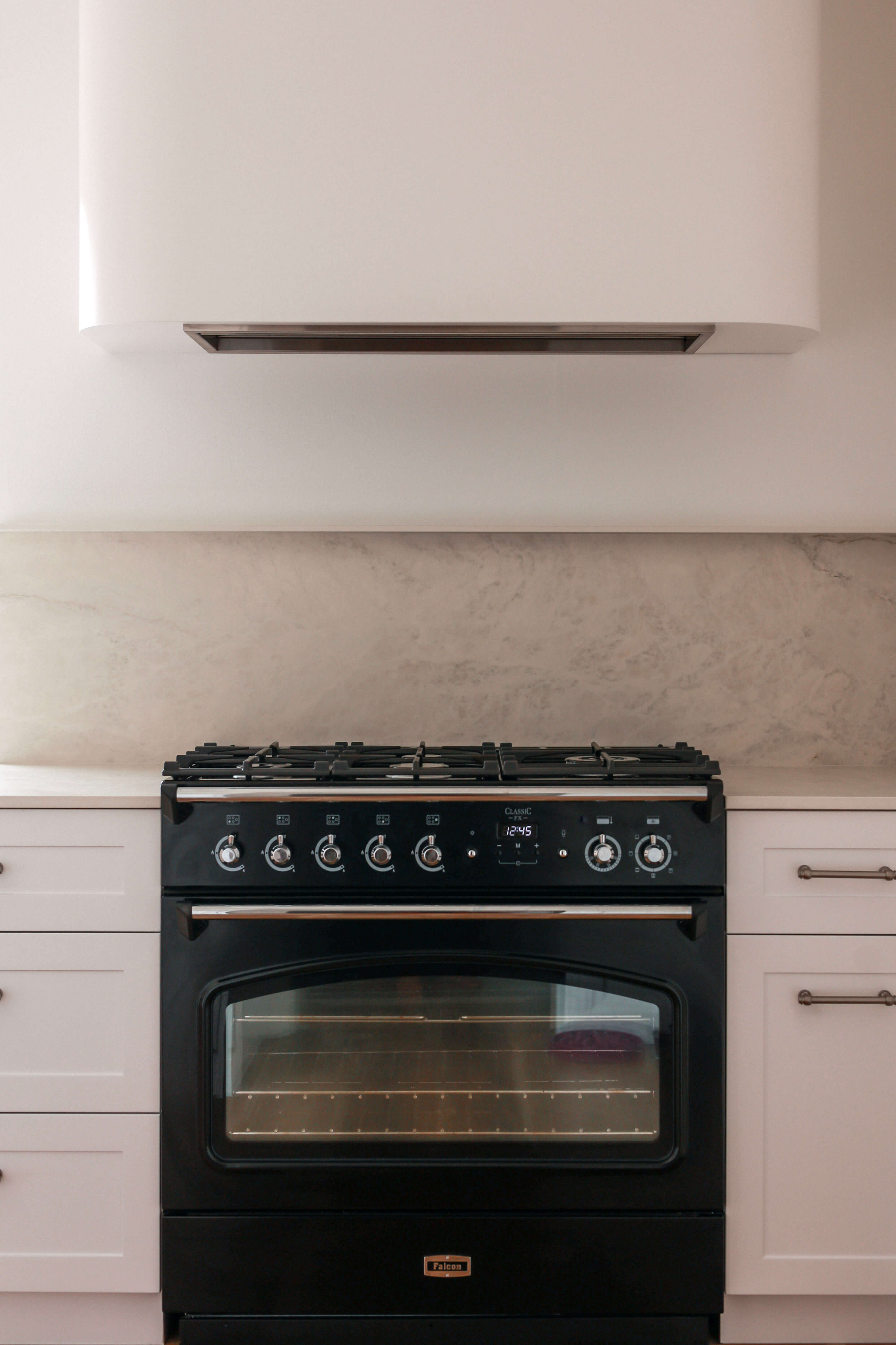 This space is modern elegance done right: clean lines, tonal textures, and a soothing mix of bright whites and gentle stone hues. Brushed metal hardware adds a refined, timeless edge, while the black freestanding cooker becomes a subtle focal point — grounding the palette without overwhelming it.
