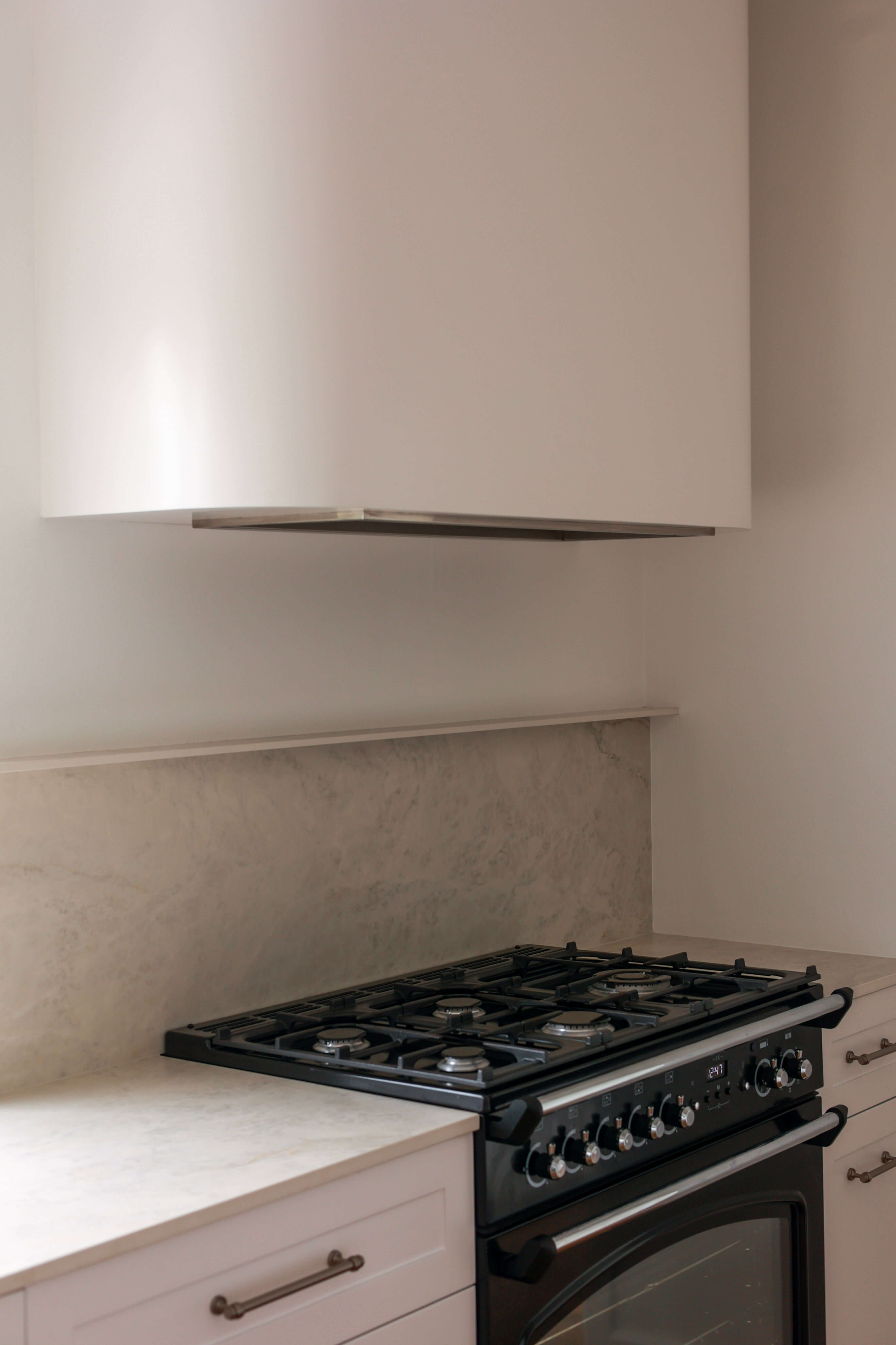In this kitchen, that integration is elevated even further with a custom, sculptural shroud that blends seamlessly into the white backdrop. The result is beautifully architectural — a feature that feels “built-in”, not bolted on.